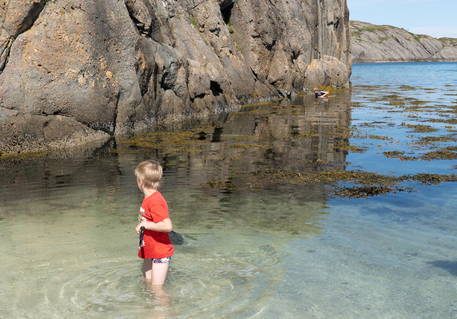 Jonas og Loke på krabbejakt. Loke nærmest og Jonas langs med berget med vann til under armene.